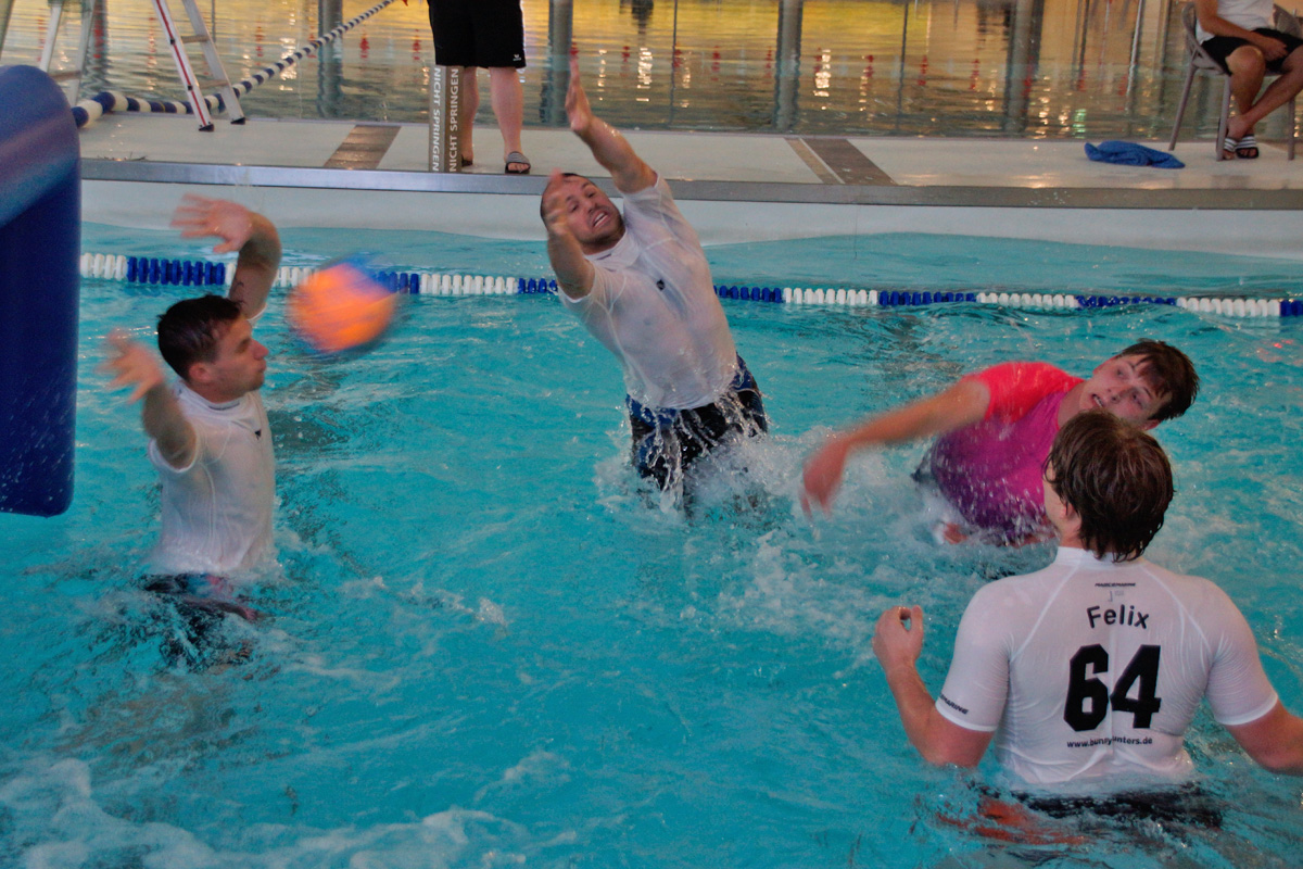 Auch die zweite offene Mannschaft der Bunnyhunters trat mit Michelle Pfaller, Patrick Frank, Vroni Kölnl, Samantha Schneider, Thomas Brandl und Peter Demmelmayr an. Besonders Letzterer zeigte in der Begegnung gegen Soest, dass er immer noch was von Aquaball versteht: In den letzten Sekunden des Spiels, in denen man schon an eine Verlängerung dachte, versenkte er den Ball unhaltbar in die obere Ecke des gegnerischen Tores. Für diese beeindruckende Aktion erhielt er sogar Anerkennung von den Münchner Spielern – ein echtes Highlight!