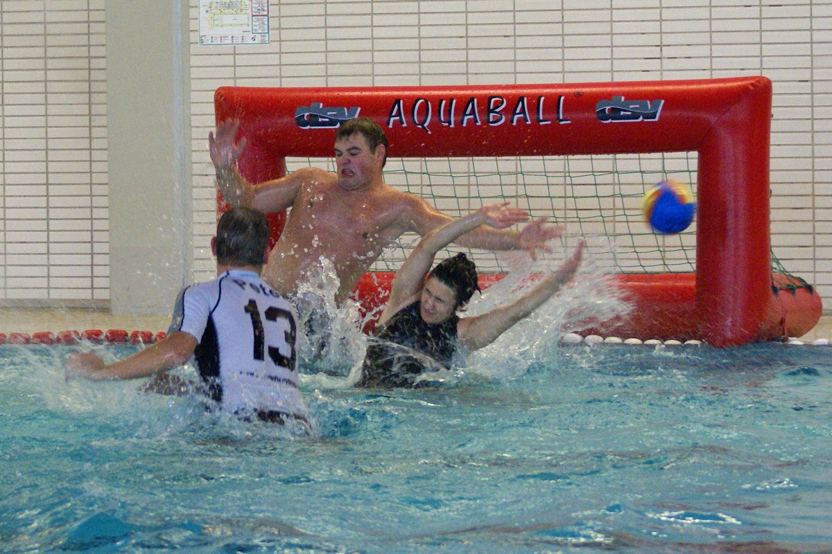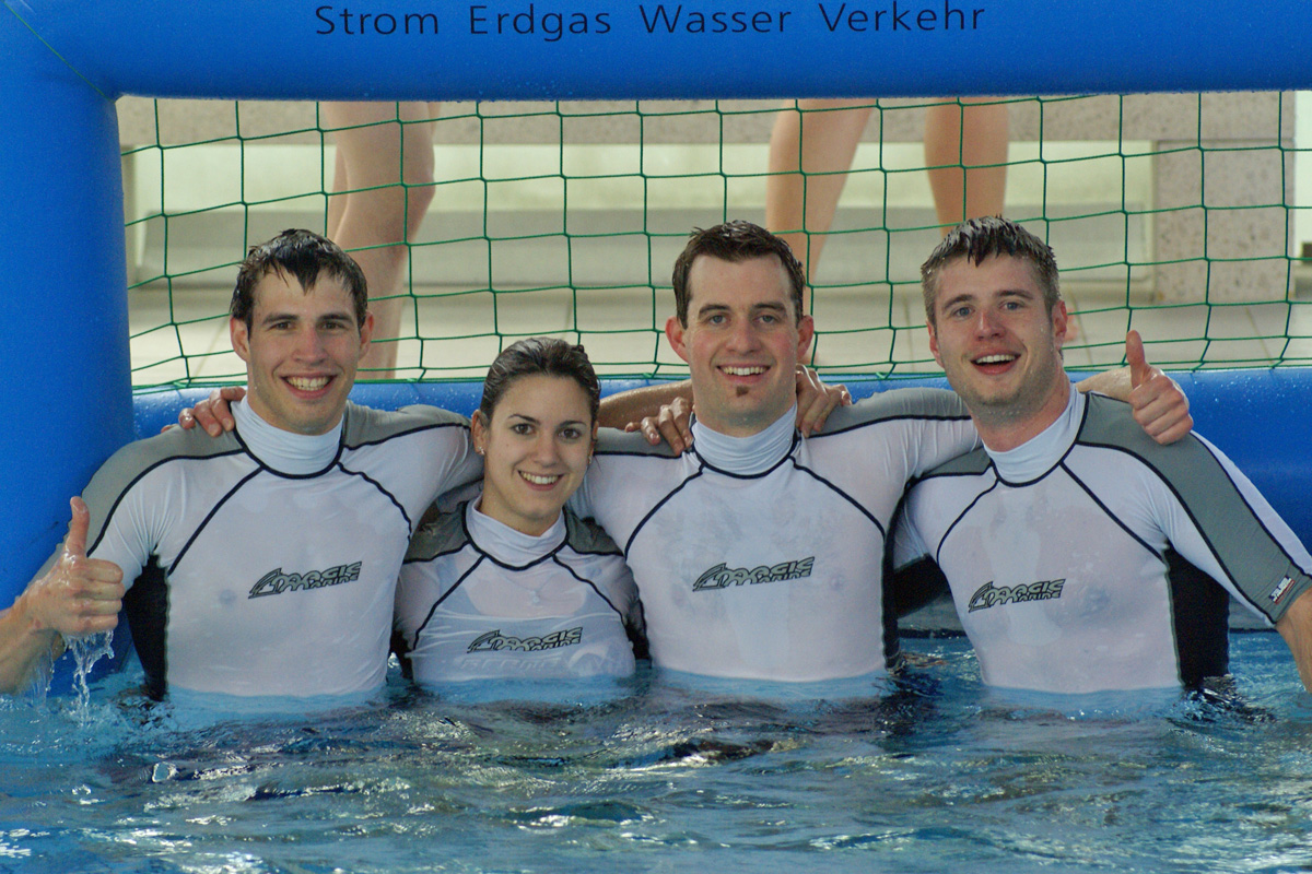 In der offenen Wertungskategorie trat Dachau mit zwei Teams an: um es kurz und schmerzlos zu machen: Die zweite Mannschaft, in der Daniel Schermelleh, Rafaela Sandeck, Henning Knebel, Marcus Schramm und Gastspieler Sergio Olivares spielten, verlor alle Spiele bis auf eines: das allerletzte gegen die eigene Erste . Dadurch schubste sie das Team aus dem eigenen Verein nicht nur vom sichergeglaubten Platz an der Sonne, sondern vernichtete zugleich die frühzeitige deutsche Meisterschaft. Die Dolphins aus Werl durften sich schließlich ungläubig über das Geschenk der Dachauer Zweiten freuen, wohingegen der Dachauer Trainer Peter Demmelmayr bedient war. Aquaball als Sportart hat dadurch jedenfalls eine weitere interessante Facette hinzugewonnen, denn in allen anderen Sportarten wäre solch ein Ereignis wohl nicht denkbar (Stichwort: Stallregie). Die erste Mannschaft der Bunnyhunters, in der neben Demmelmayr noch Andreas Lutzenberger, Andreas Reuschel, Malina Frischholz und Mark Schmidt spielten, hatte bis zum letzten Spiel in dem meisten Spielen überzeugt und etliche Male deftige Rückstände aufgeholt. Gegen eine zum Schluss hochmotivierte eigene Zweite jedoch versagten im Sudden Death die Nerven und man fühlte sich absolut nicht hervorragend hüstel.