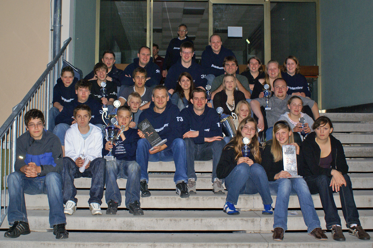 Die offene erste Mannschaft konnte sich in einem wahren Herzschlagfinale knapp gegen den Vorjahresmeister aus Werl durchsetzen und setzte sich damit zum ersten mal die Krone auf. Gut aufgelegte Torhüter, ein treffsicherer und mit viel Übersicht spielender Spielertrainer Peter Demmelmayr, der wurf- und sprunggewaltige Andreas Lutzenberger sowie die schnelle und Lücken für die Werfer reißende Malina Frischholz ermöglichten der Ersten einen verlustpunktfreien Durchmarsch zum abschließenden Endspiel gegen die Dolphins aus Werl. Hier lagen tapfer kämpfende Dachauer zur Halbzeit 1:3 zurück, und kurz danach lautete das Zwischenergebnis sogar 1:4 aus Dachauer Sicht. Doch die Bunnyhunters ließen sich weder aus der Ruhe noch aus dem Konzept bringen. Dachau holte Tor um Tor auf, und in der Endphase dieses Spiels war es an den beiden Torhütern, in Erscheinung zu treten und das Spiel zu entscheiden. Erst gelang Ingmar Guse mit einen coolen Lupfer wenige Augendblicke vor Ende der regulären Spielzeit der Ausgleichstreffer zum 7:7, bevor Mark Schmidt im Sudden Death der Siegtreffer für die Bunnyhunters gelang: Erneut Ingmar gab den entscheidenden Pass, Peter und Andi banden die Abwehrspieler perfekt und Mark konnte frei vor dem Torwart gottseidank den Ball ins Werler Tor wuchten und Dachau damit zum "inoffiziellen" DEUTSCHEN MEISTER machen.