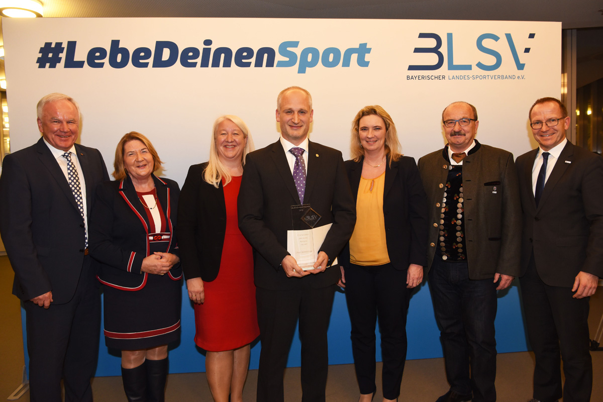 Am 29. November wurde unser Abteilungsleiter Peter Demmelmayr im Bayrischen Staatsministerium für Familie, Arbeit und Soziales mit dem BLSV Ehrenamtspreis ausgezeichnet. Hier wurden stellvertretend für die über 300.000 Ehrenamtlichen in ganz Bayern 7 Persönlichkeiten aus den einzelnen Bezirken sowie 3 Personen in Sonderkategorien geehrt. In der Sonderkategorie "Inklusion" wurde Peter für seine Verdienste in der Sportart Aquaball geehrt. Die Laudatio hielt hierbei die Hausherrin herself - Staatsministerin Kerstin Schreyer. Sie würdigte in ihrer Ansprache sein langjähriges Handeln für die Sportart Aquaball aber vor allem seinen Weg für die Inklusion in diesem Sport. Bekanntester Preisträger des BLSV Ehrenamtspreises war Uli Hoeneß, der für sein soziales Engagement ausgezeichnet wurde und Peter ebenfalls zu seinem Preis gratulierte.