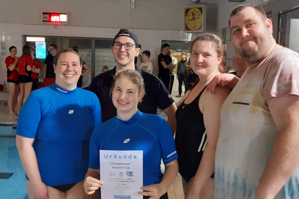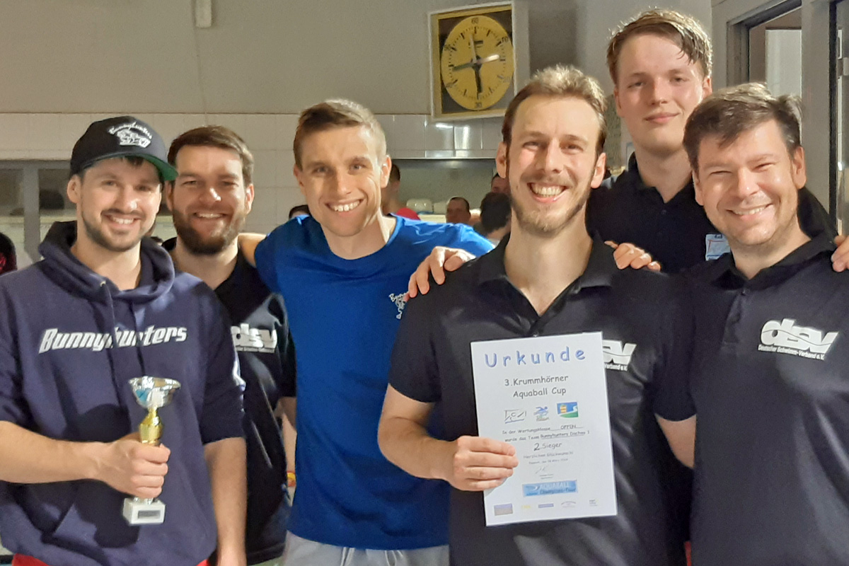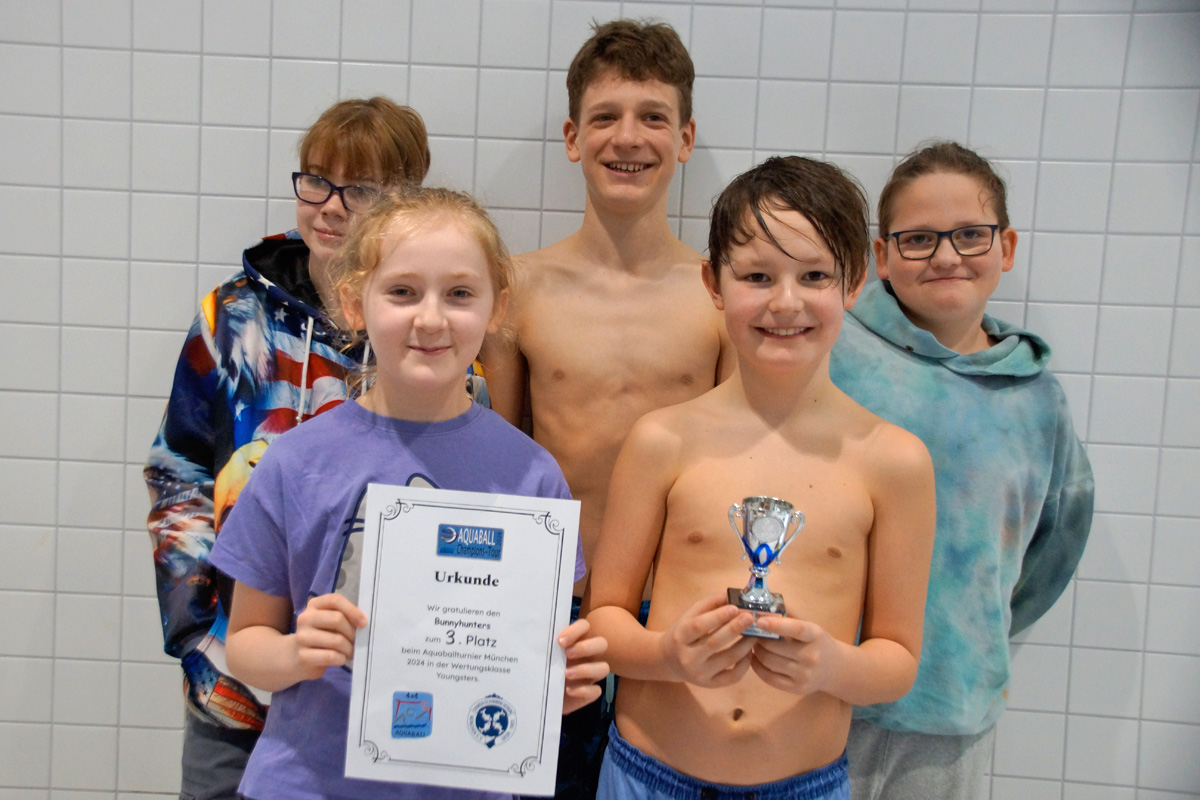 Ein weiterer Höhepunkt aus Dachauer Sicht war das Abschneiden der Youngsters, die mit Rang 3 den dritten Podestplatz an diesem Tag für die Bunnyhunters einfahren konnten. Die Mischung aus erfahrenen und neuen Spielern und Spielerinnen fand sich in dieser Konstellation gut zurecht, wobei besonders Selma Kempe in ihrem allerersten Aquaballturnier überhaupt zu überzeugen wusste. Als das Spiel gegen die Ingolstädter in die Verlängerung ging, fasste sie sich kurzentschlossen ein Herz und versenkte den Ball unter großem Jubel eiskalt im gegnerischen Tor. Im weiteren Turnierverlauf zeigte das Team dann immer wieder mal ihr Potential, insbesondere im Torwartspiel. Am Abwehrverhalten muss dagegen noch weiter gearbeitet werden, damit es in den kommenden Turnieren noch höher auf dem Siegertreppchen gehen kann.