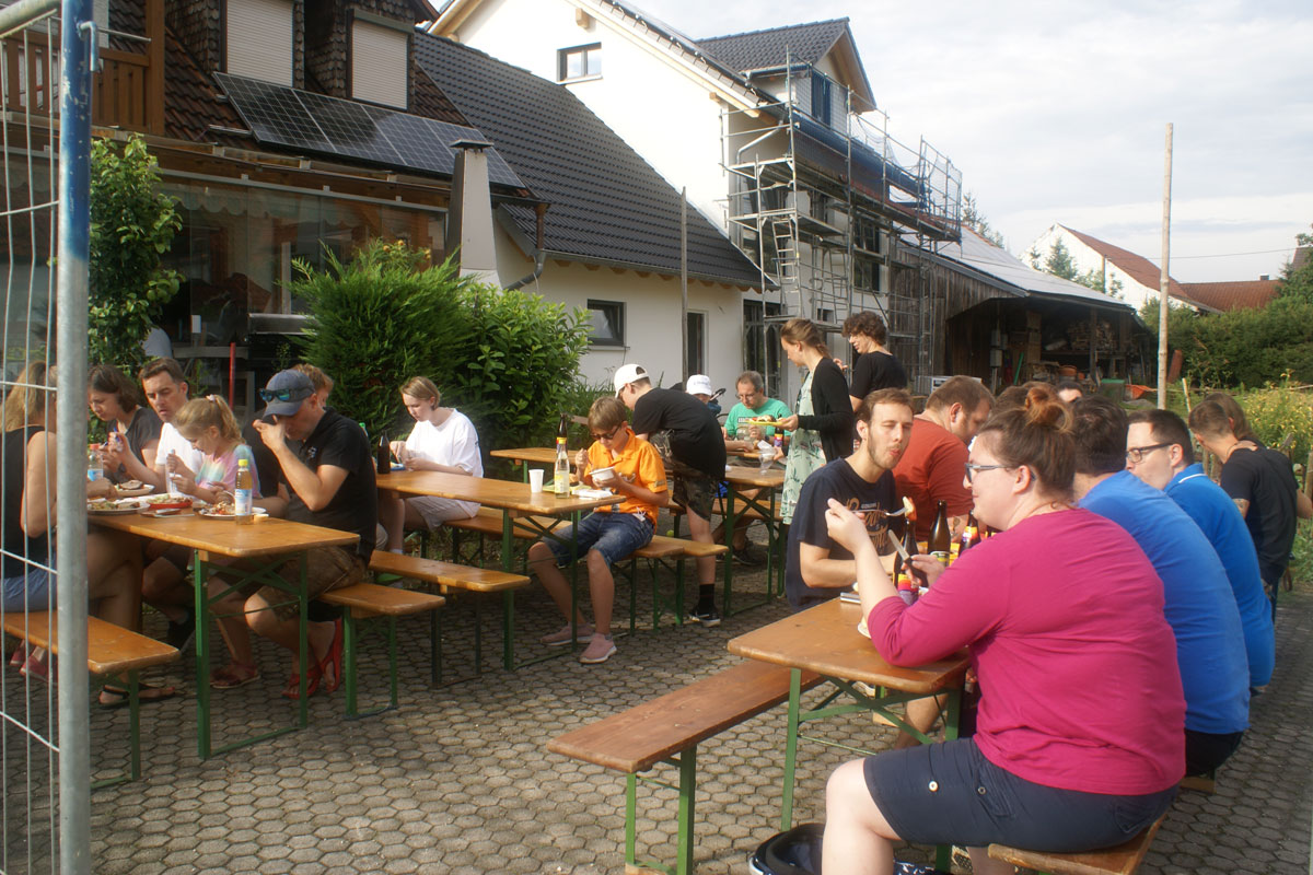 Doch die Anwesenden ließen sich nicht unterkriegen. Gemeinsam flüchteten alle in die Garage, wo man es sich beim ersten Kaltgetränk und guten Gesprächen gemütlich machte. Trotz des plötzlichen Unwetters wurde die Stimmung immer fröhlicher, und kaum hatten sich alle eingelebt, zeigte sich die Sonne wieder am Himmel – ein wahrer Glücksfall!